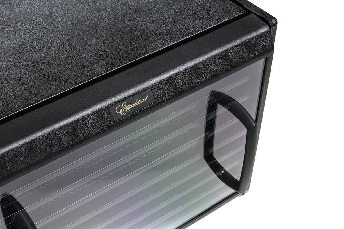 Для виготовлення сушарки Excalibur використовувалися високоякісні матеріали – корпус, лотки, дверцята і каркас сушильних лотків виготовлені з міцного екологічного BPA-free пластику. Двері виготовлені із загартованого безпечного скла. Прозорі дверцята дуже зручні у використанні – легко знімаються і встановлюються назад. Всі компоненти виготовлені та зібрані в США.
