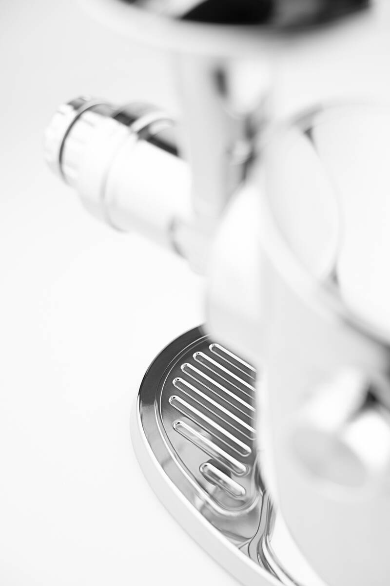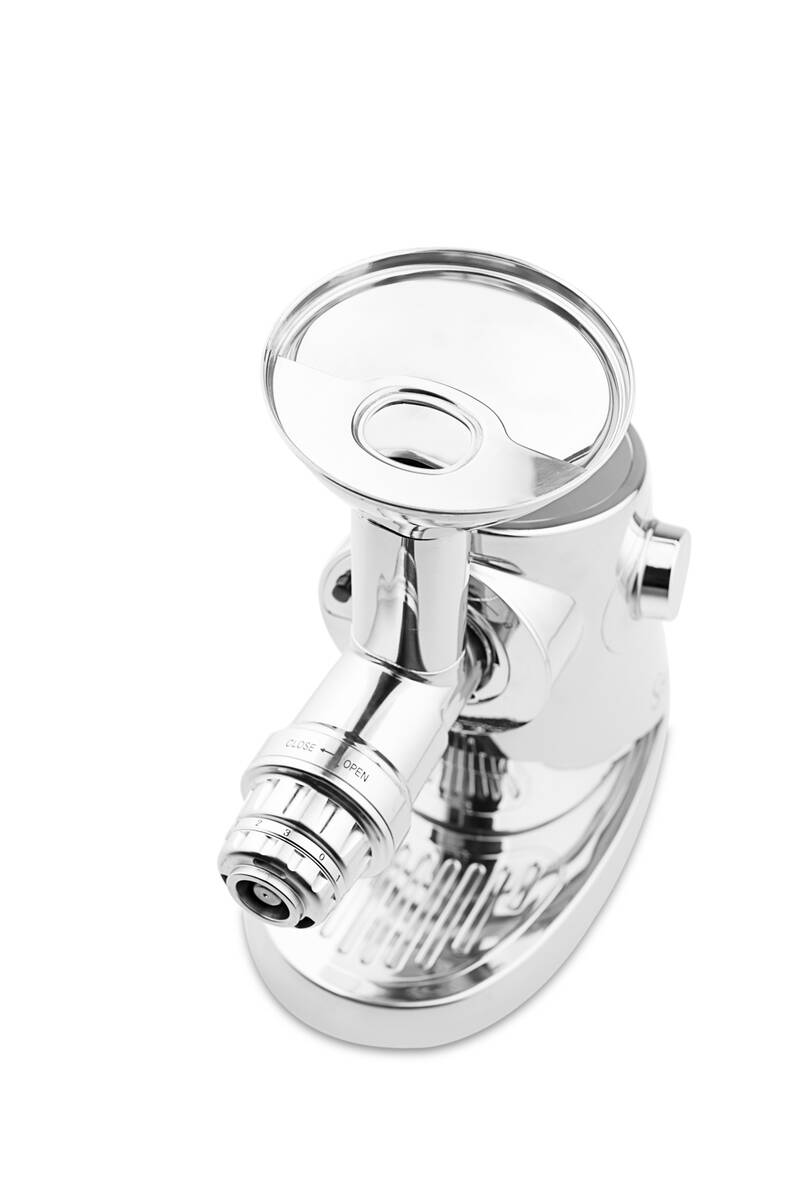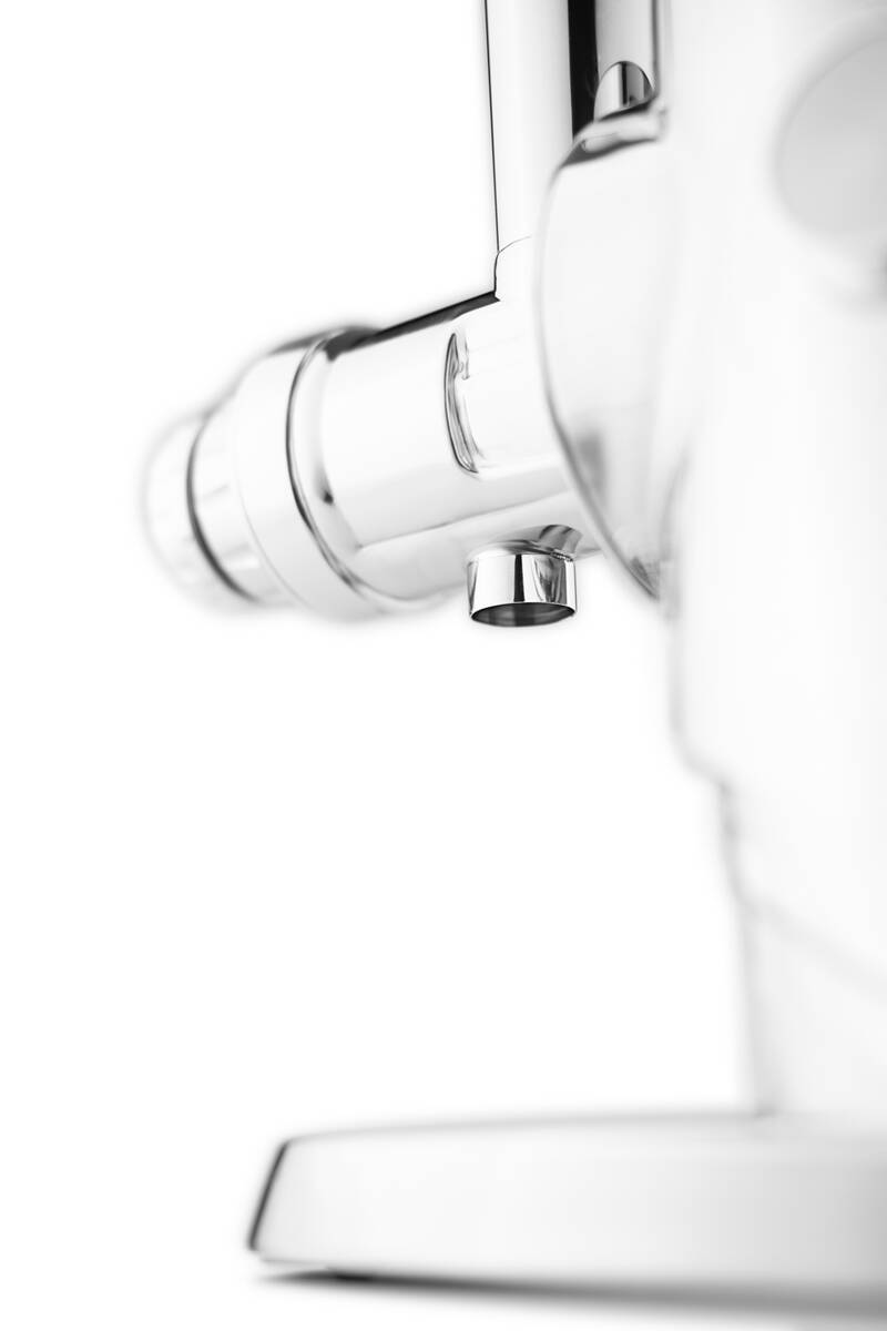 Кришка барабана зі змінним тиском виготовлена з міцної нержавіючої сталі, як і всі частини соковижималки, і дозволяє регулювати тиск у вихідному отворі для м’якоті. Найнижчий рівень ідеально підходить для продуктів з високим вмістом соку, а також м’яких фруктів. А от якщо збільшити його до максимуму, то ми отримаємо найвищу потужність стискання таких продуктів, як селера, листова зелень і коренеплоди.